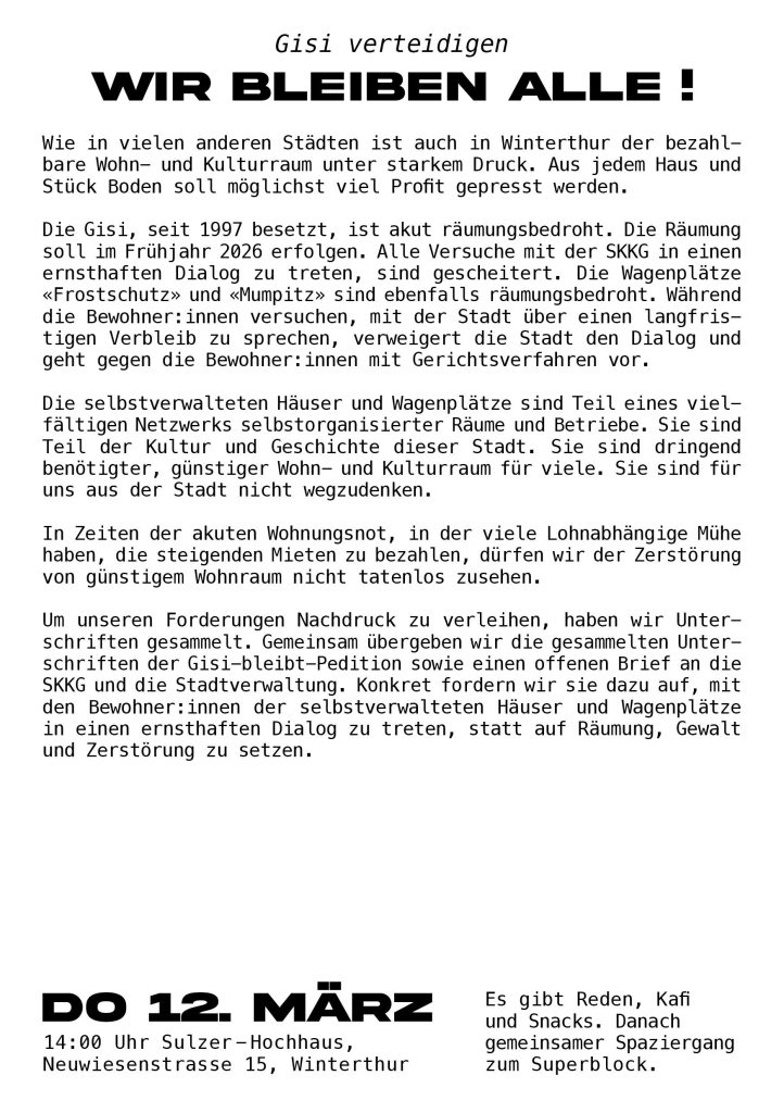 Am Samstag, 20.12.2025, nahmen sich in Winterthur über 500 Menschen die Strassen, um gegen die geplante Räumung der Gisi (General-Guisan-Strasse 31) und für den Erhalt von günstigem, selbstverwaltetem Wohnraum zu demonstrieren. Wir wurden dabei tatkräftig von Leuten aus der ganzen Schweiz unterstützt. Trotz Grossaufgebot der Bullen liessen wir uns nicht einschüchtern.