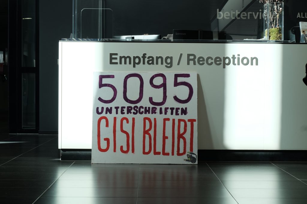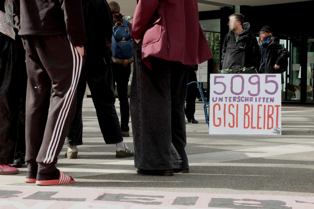 Aus diesem Grund fordern wir, dass die Verantwortlichen der SKKG endlich mit uns in Verhandlungen treten und auf unsere Anliegen eingehen. Wir fordern nach wie vor einen Baurechtsvertrag, damit die Selbstverwaltung der Gisi auch für die Zukunft sichergestellt ist. Falls es nicht möglich sein sollte, einen solchen Baurechtsvertrag einzugehen, fordern wir ein Ersatzobjekt, sowohl für den Wohn- als auch für den Kulturraum.