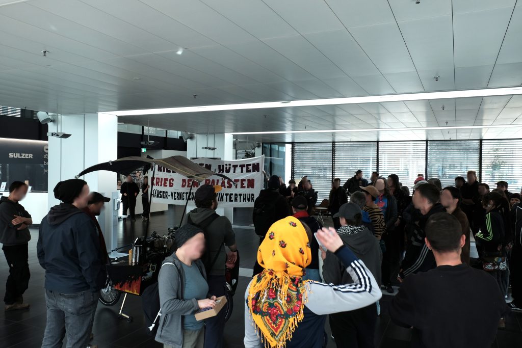 Eigentlich wollten wir die Unterschriften und den offenen Brief der SKKG-Direktorin Bettina Stefanini und dem Präsident des SKKG-Stiftungsrats Thomas Meier übergeben. Das haben wir der SKKG frühzeitig mitgeteilt. Doch Stefanini und Meier machten, was sie immer tun: Sie weigerten sich. Sie schickten stattdessen den Werbechef der Verwaltungsfirma Terresta, Ariel Leuenberger. Dieser wiederum weigerte sich, Stefanini oder Meier anzurufen. Darum blieben wir lautstark während gut 45 Minuten im Foyer des Sulzer-Hochhauses mit Musik, Kaffee, Reden, Transparenten und Gesang. «Die Stimmung war sehr kämpferisch und stabil», sagte Sandra, eine der von der Räumung bedrohten Anwesenden.