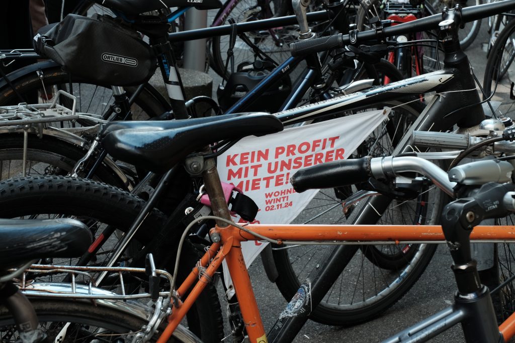 Wir zogen danach als Spontandemo mit Transparenten, Musik und Parolen weiter: über den Hauptbahnhof durch die Marktgasse bis zur Steinberggasse,der Wohnadresse der Millionenerbin und SKKG-Direktorin Bettina Stefanini. Wir versuchten ein weiteres Mal,ihr die Petition zu übergeben. Leider vergeblich. Unterwegs informierten wir über den Grund unserer Demo. Wir solidarisierten uns mit allen von der Wohnkrise Betroffenen und mit den kämpfenden Busfahrer:innen von Stadtbus Winterthur.