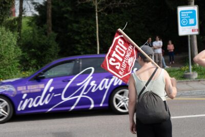 – Zum Ende des Spaziergangs wurde zudem eine Grussbotschaft aus Schwammedingen verlesen, wo gleichzeitig eine Kundgebung stattfand. Es wurde über die Vertreibung der Armen aus den Quartieren berichtet und darüber, dass wir uns zusammen organisieren müssen. Auch gab es eine Rede zur kürzlichen Räumung zweier Hausbesetzungen in Chania, Kreta, die Hotels weichen sollen.