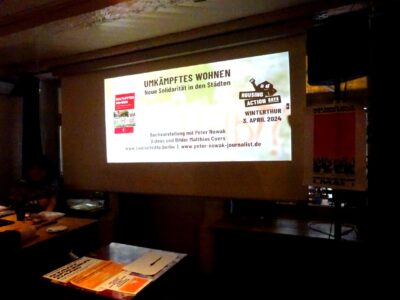 Am Dienstag 3. April fand im Widder eine gut besuchte Buchvorstellung zum Buch «Umkämpftes Wohnen» mit dem Journalisten Peter Nowak aus Berlin statt. Das Buch versammelt verschiedene Beiträge aus Berlin, Dresden, Barcelona, Milano und anderen Städten zu sehr unterschiedliche Kämpfen um Wohnraum, um Besetzungen und um das Recht auf Stadt und wie Solidarität in den Städten entstehen kann. Zudem schauten wir kurze und bestärkende Ausschnitte des Films «Mietrebellen» und diskutierten eigene Erfahrungen und Gemeinsamkeiten.
